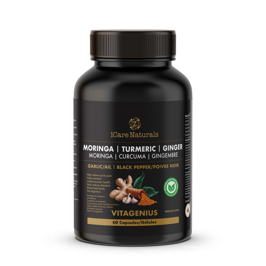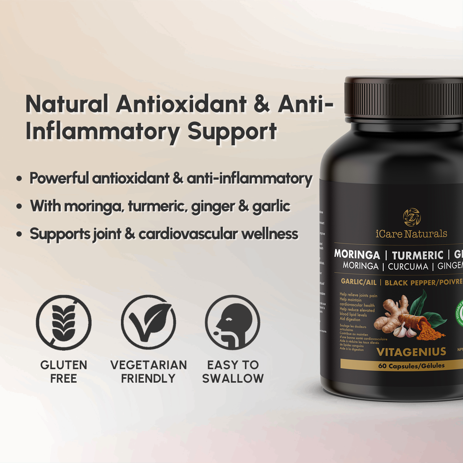 VitaGenius - Super Food & Antioxidant formula with Moringa, Turmeric, Ginger, Garlic & Black Pepper. Used in herbal medicine to assist joint pain relief, maintain cardiovascular health, help reduce elevated blood lipid levels & aid digestion