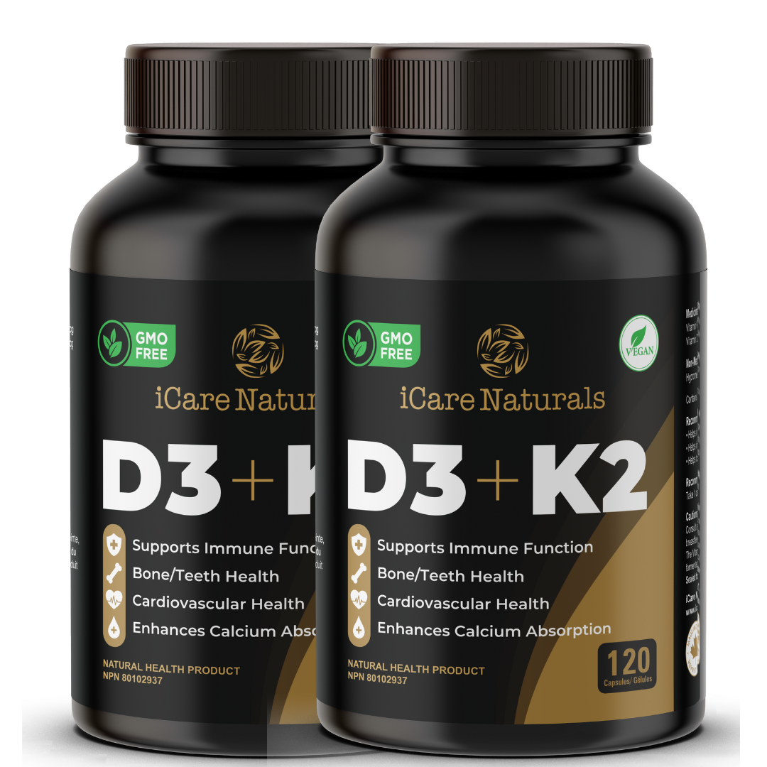 iCare Naturals D3+K2 | Canadian-Made High Potency 1000 IU/120MCG - 120 Capsules - Helps Maintain Bone & Teeth Health - With MK-7 For Best Results - Support Immune System - Vegan