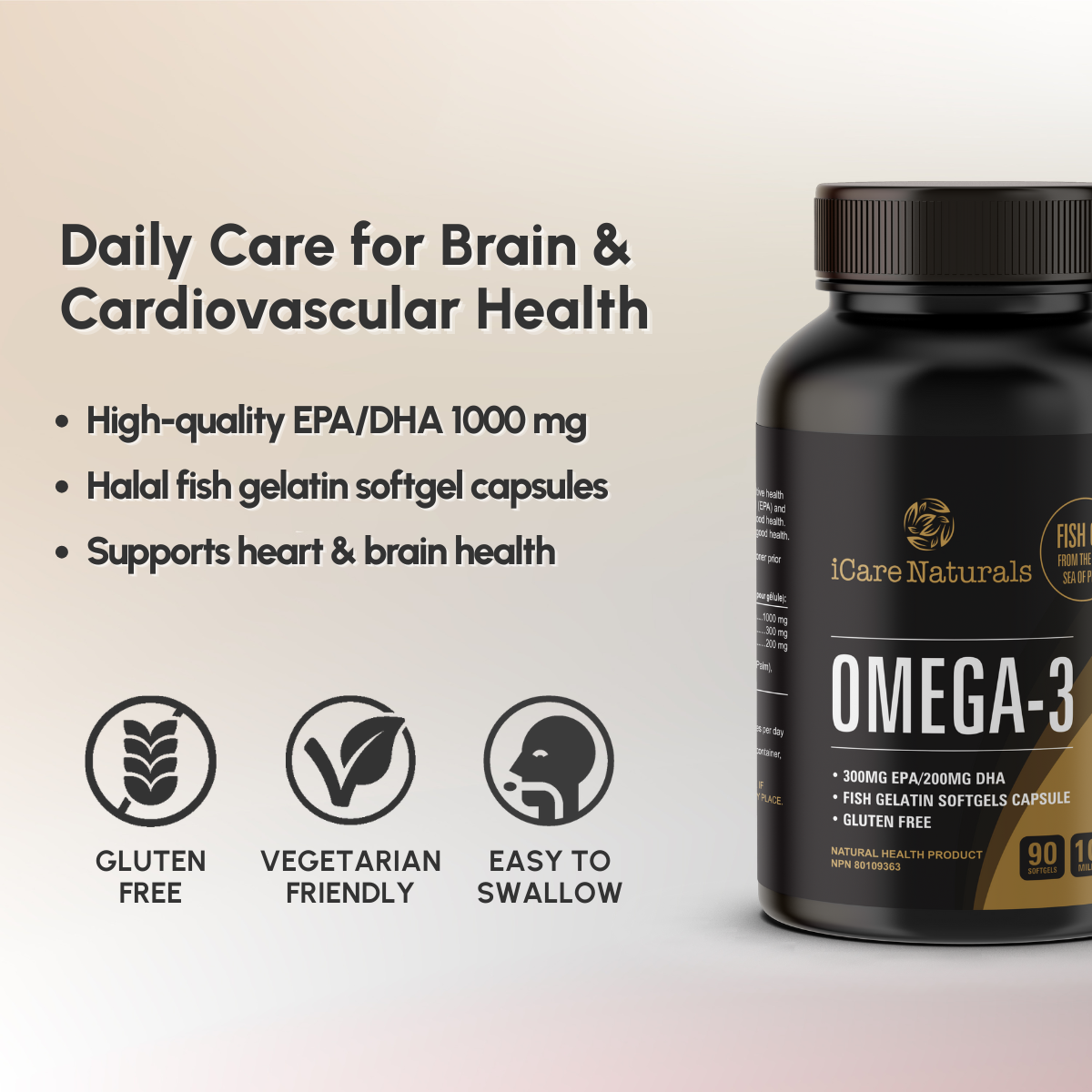 iCare Natural's halal Omega 3 Fish Oil for both men and women provides you with your daily Omega 3 EPA/DHA Requirements. Fish Oil Omega-3s benefits are enormous and these are nutrients that are not created by the body and can only be taken from our daily diet. They're key to the structure of every cell wall you have. They're also an energy source and help keep your heart, Lungs, blood vessels, and immune system working the way they should.Â