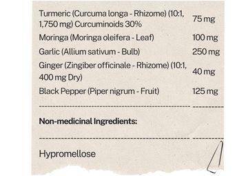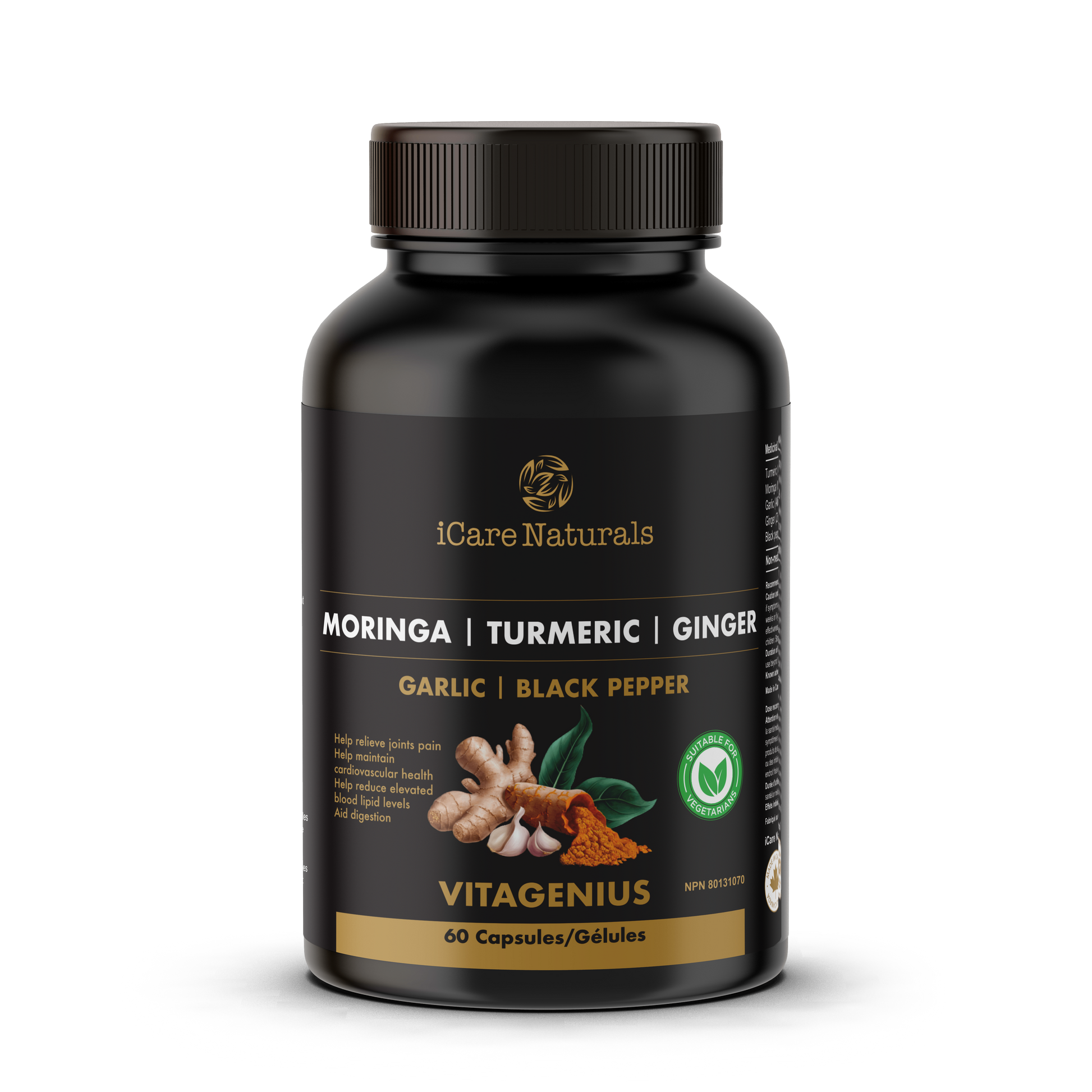 Vita Genius contains Moringa, Turmeric, Ginger, Garlic, and Black Pepper. These ingredients support joint health, cardiovascular function, and digestion, while providing antioxidant benefits.